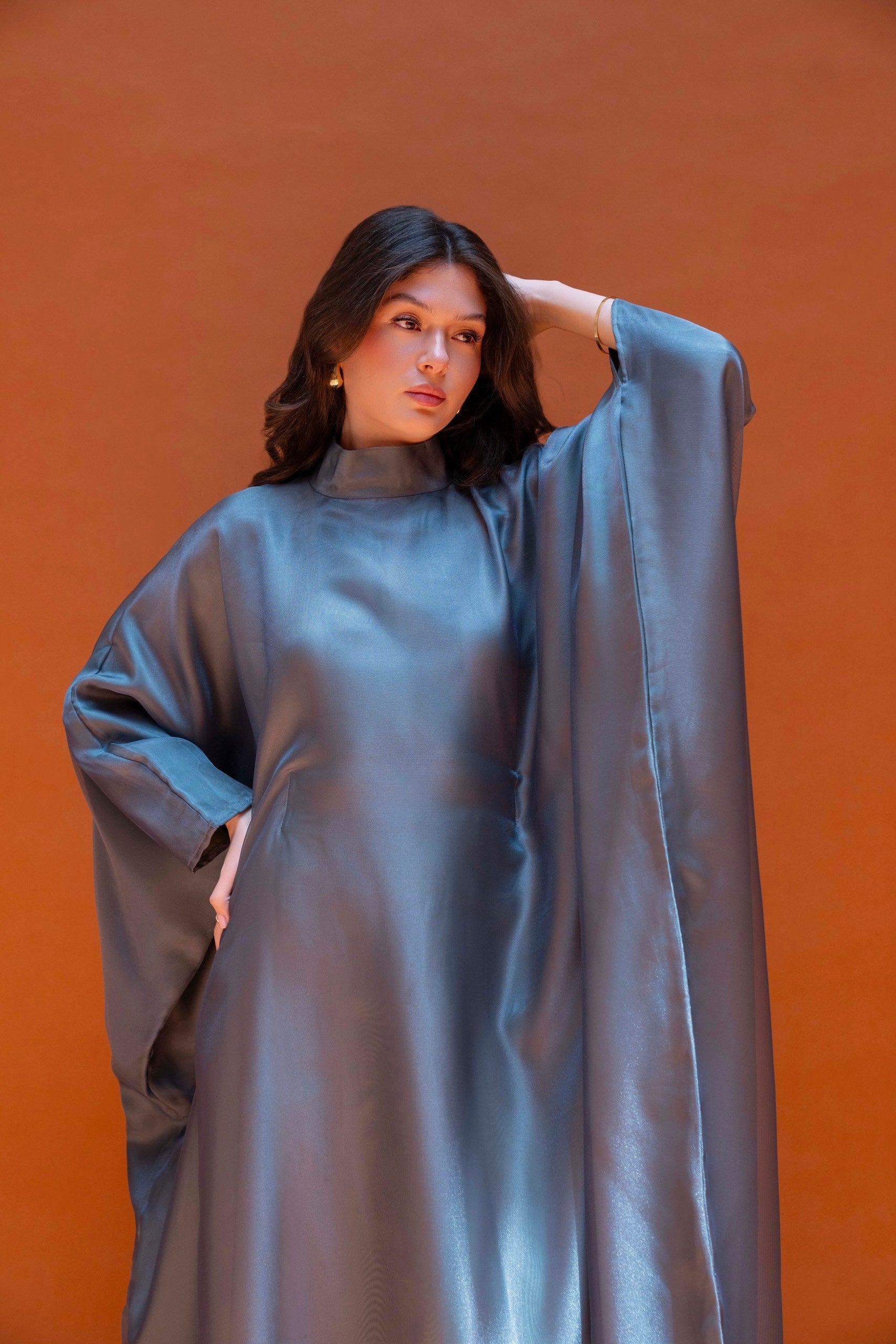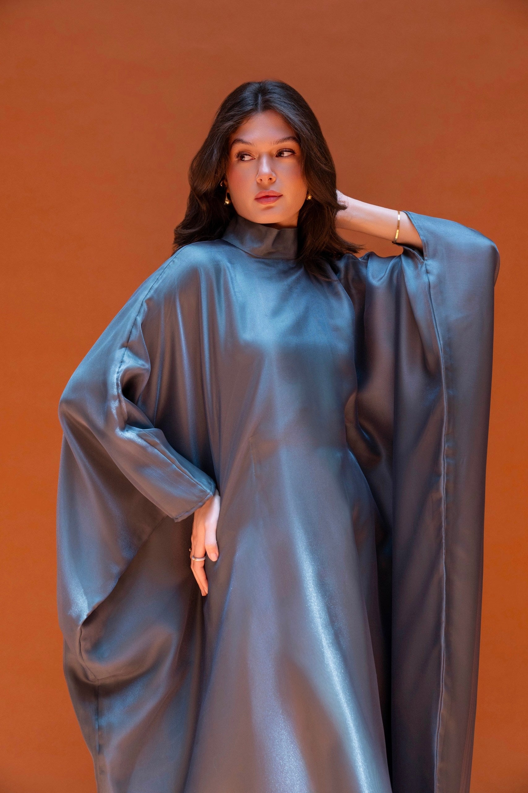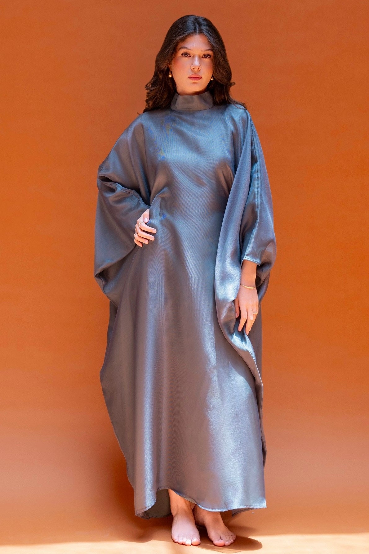 Bathed in a cool, moonlit sheen, Blue Hour captures the quiet mystery of twilight just before nightfall. Featuring wide sleeves, a fluid silhouette, and a hidden inner belt for customizable shape, it brings structured elegance to an otherwise effortless drape.