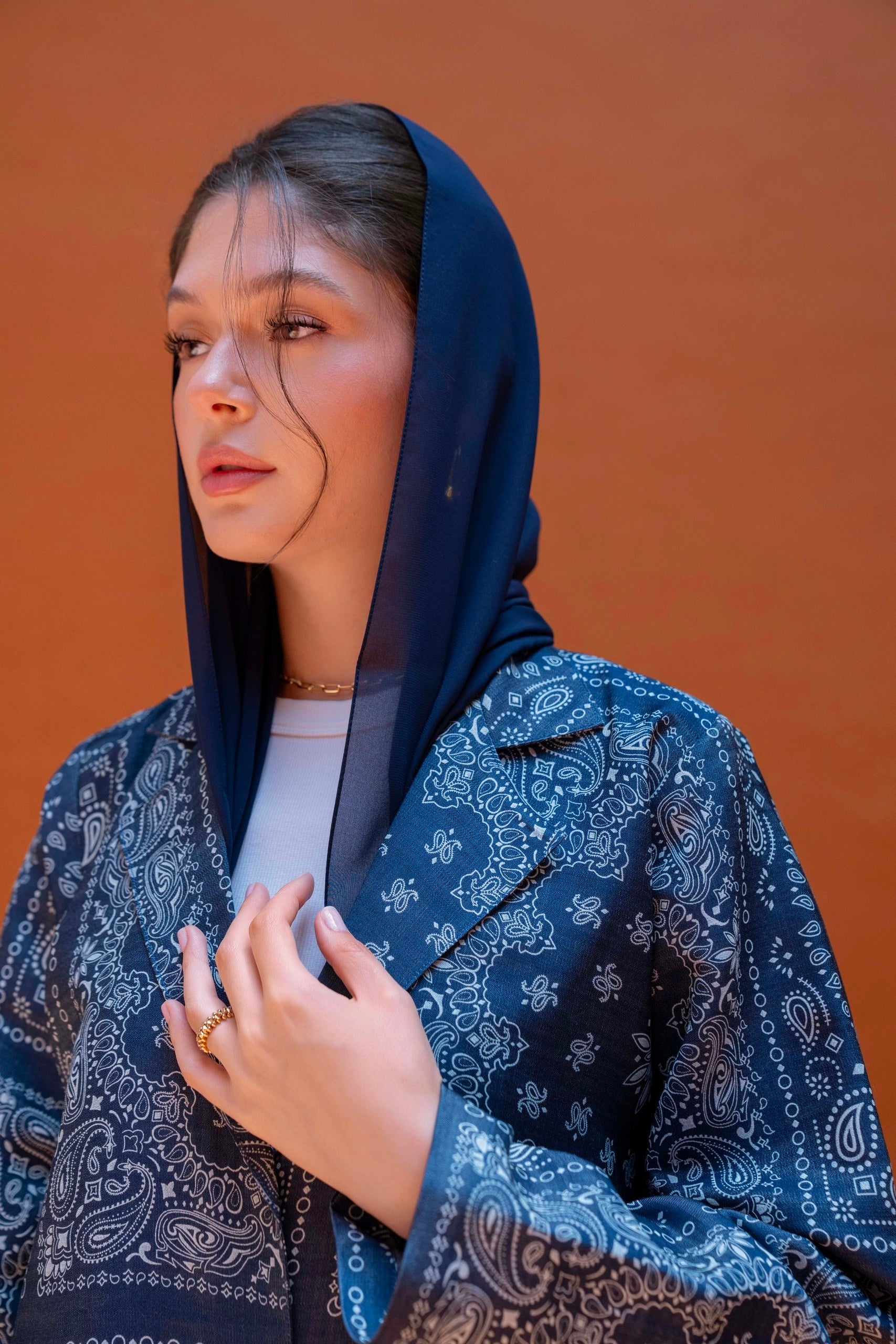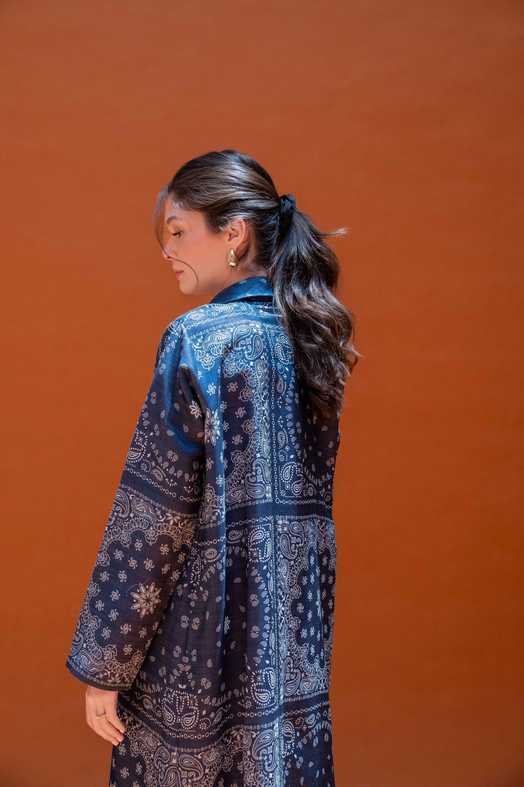 Elevate your wardrobe with our Denim Paisley Blazer Abaya. Featuring a bandana-style paisley print with floral and celestial motifs, this blazer-style abaya exudes sophistication. Its structured design evokes a serene night sky, making it perfect for any occasion. Made from denim, it combines comfort and style seamlessly.