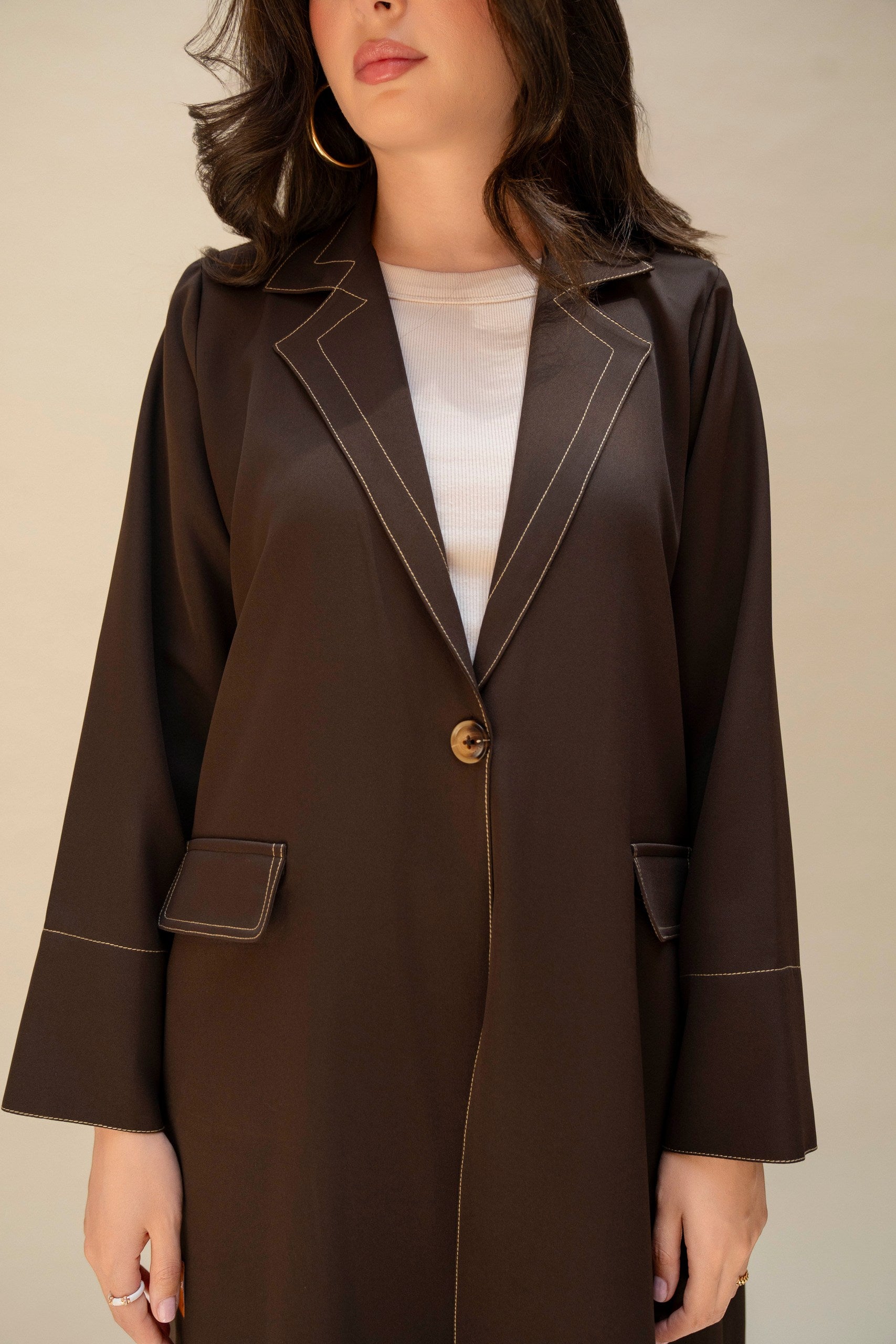 A modern minimalist abaya that embodies calm elegance with its clean lines, subtle contrast stitching, and structured shoulder pads. Finished with a signature logo button, its lightweight structure and refined detailing make it perfect for warm, tranquil days.